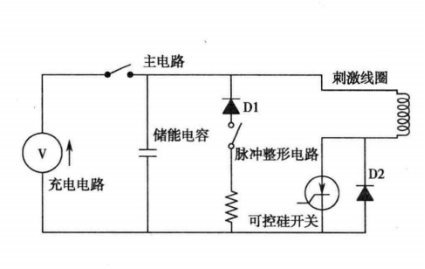 TMS設(shè)備最基本的簡化電路由主電路和刺激線圈組成,主電路由充電電路、儲能電容、脈沖整形電路以及可控硅開關(guān)幾部分構(gòu)成。